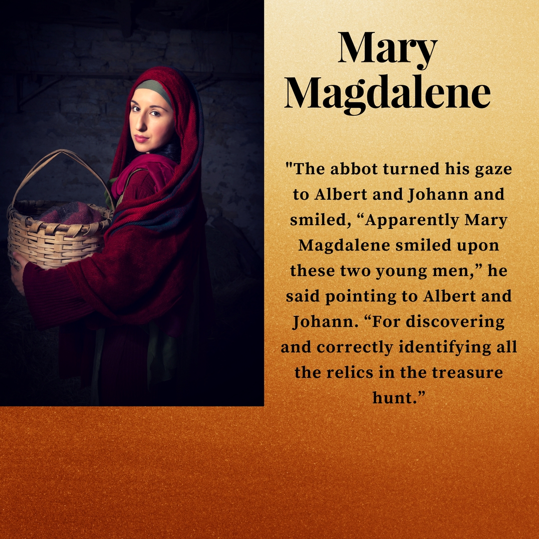“Well, I don’t know about the story,” Albert said, “but I’m sure glad your secret studies included the relics of the monastery. I would have had no idea which relic matched what clue.”